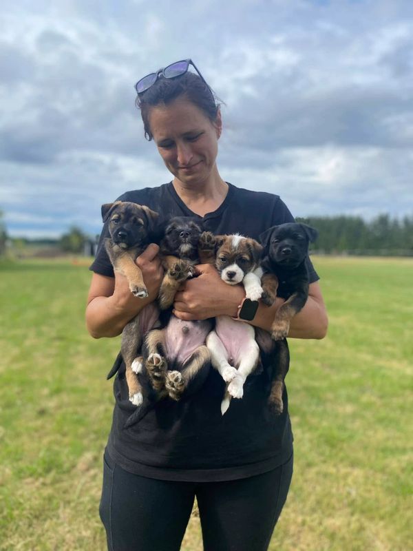She lives in a busy, animal-filled home alongside two young children, multiple dogs, and a variety of farm animals. Her temperament and versatility made her the perfect match for Cheese, and together they produced six exceptional puppies.